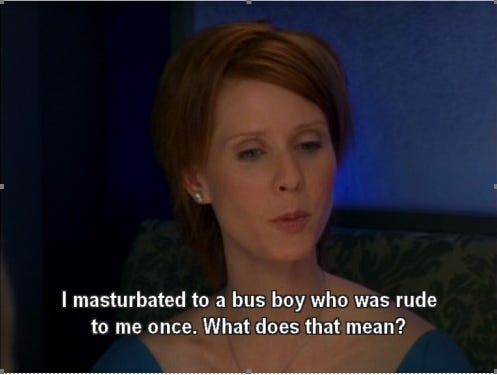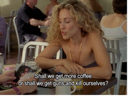 Yes but probably not more than you if you’re going to be really objective with yourself, and that is why she is a compelling character. See: Emily Nussbaum piece on how Carrie is an anti-heroine whose sins of infidelity and being way too into expensive shoes deserve the level of cultural reverence usually reserved for the likes of Don Draper and Tony Soprano, who are not that into shoes but are way more into cheating, but, crucially, are also men. Man x (infidelity – shoes) = Carrie-level evil.